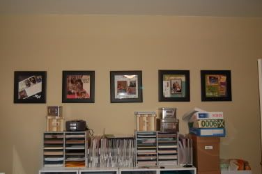 I got some scrapping done which was nice and some organizing of my room. It literally is too hot to do anything else! I've got one child with a cough and another with the severe grumpies. Anyway, this is what I did yesterday. The pics on the wall are 12x12 and there are 5 different layouts hanging including the one above. I figure I will rotate them when I sit down and put albums together.